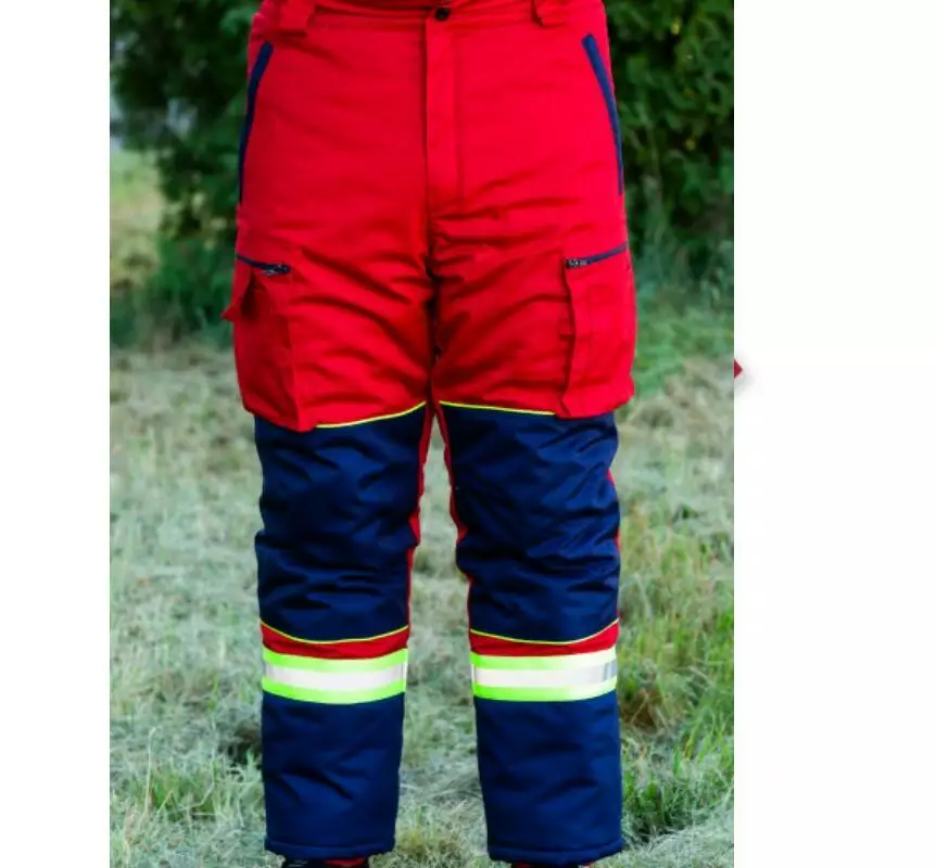 Штани медичні теплі з тканини спартак червоний, з синіми вставками.