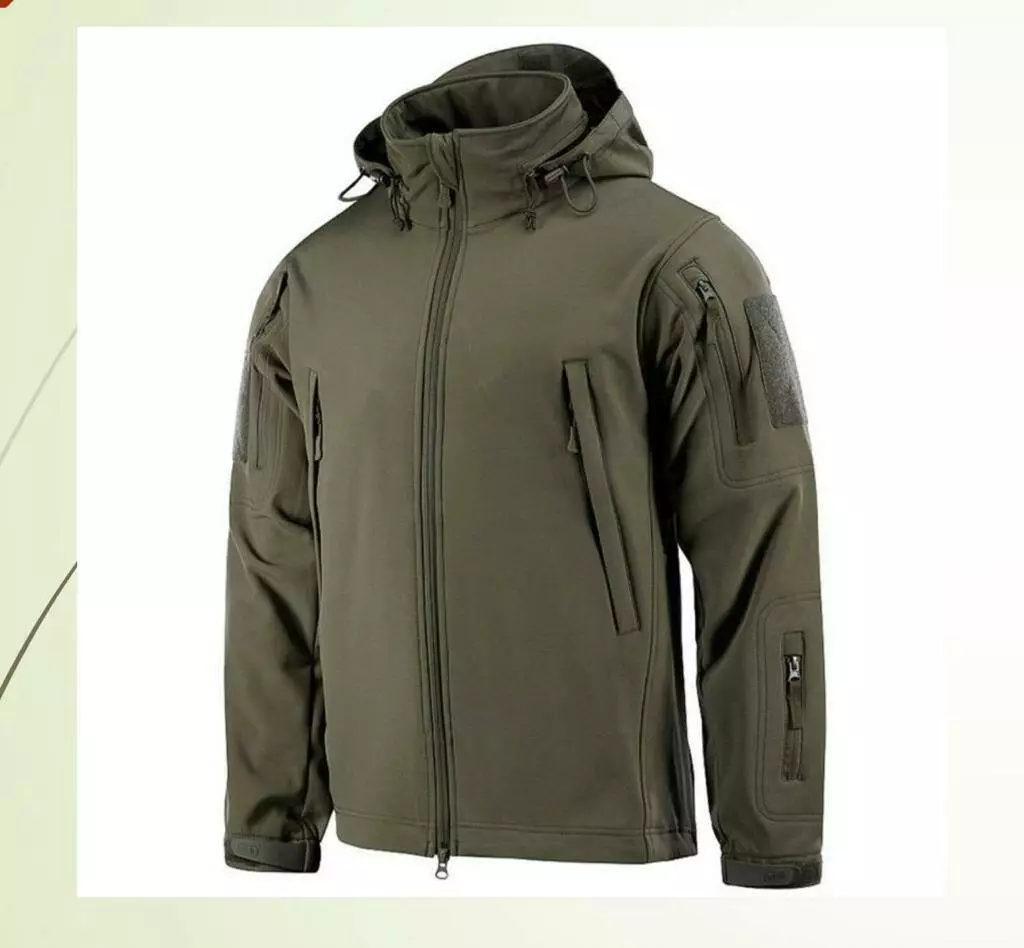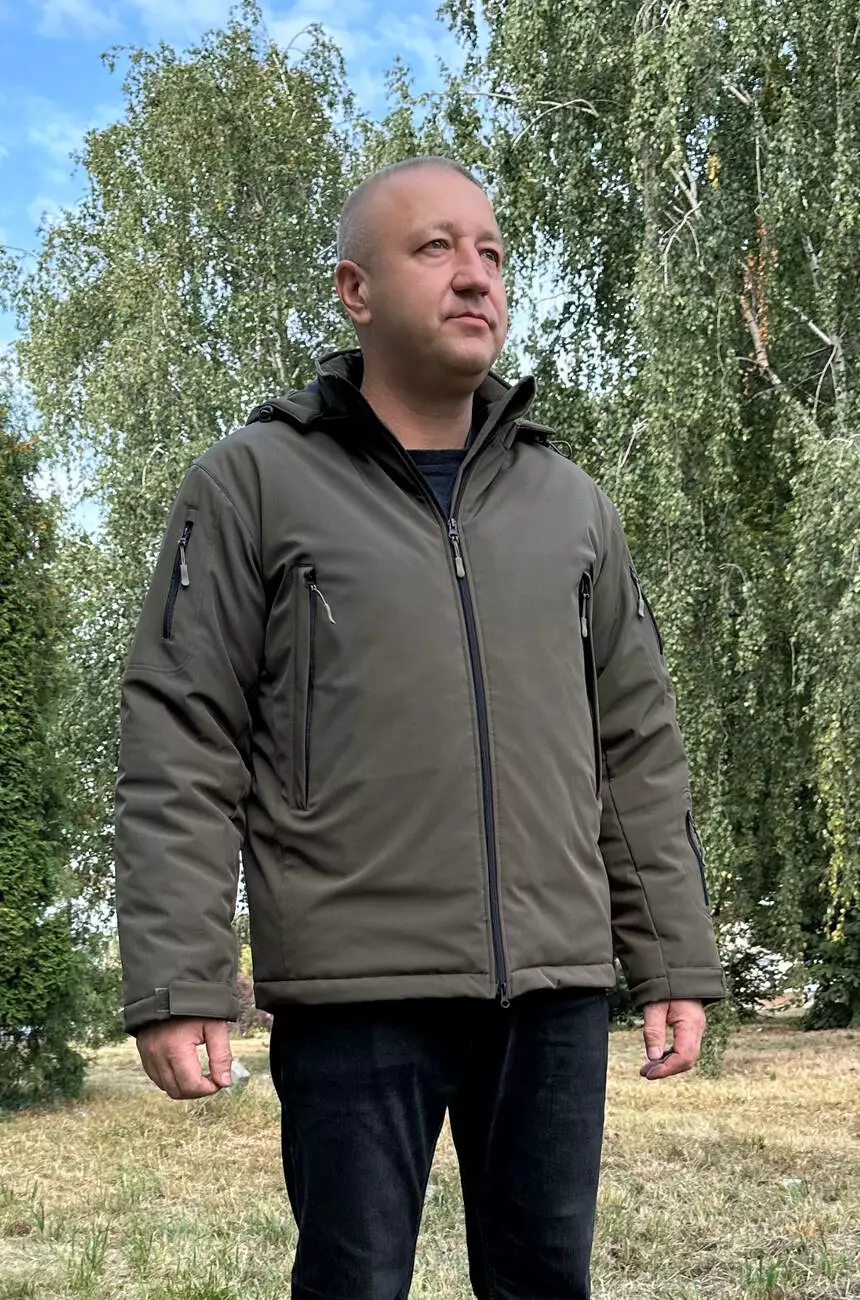 Куртка виконана із тканини «Softshell» тришарової з мембраною покриттям в кольорі темна олива, поверхнева густина -270 г/м2, водонепроникність-19 090 мм.вод.ст..